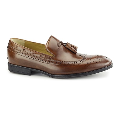 Steptronic FLECK Mens Leather Brogue Tassel Loafers Cognac The perfect combination of fashion and tradition in these Steptronic, men's loafers finished with intricate brogue design and a simple tassel. The burnished waxed leather upper keeps them looking stylish whilst the wingtip brogue pattern keeps them looking classic. Walk in luxury comfort on the sheepskin lining embedded on a cushioned insole which contours to the shape of your feet. The 100% rubber outsole allows flexibility which flexed to the natural movement of your feet whilst you walk. Pair with jeans or even a suit; perfect for any smart, casual event. Upper: Waxed Leather Lining: Sheepskin Sole: Rubber